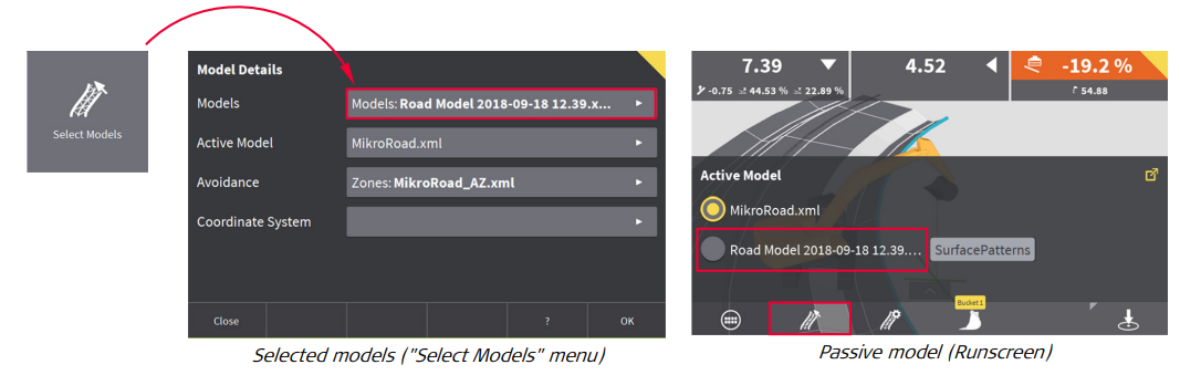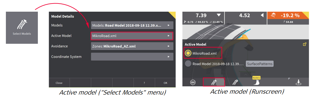 The operator can define which model should be active, directly from the runscreen or in "Select Models" menu.