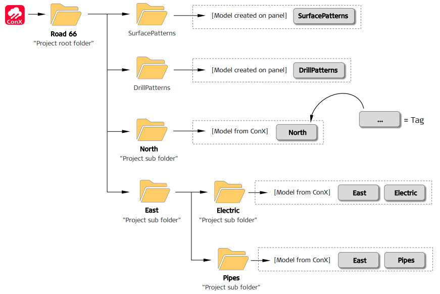The number and hieararchy of tags attached to a model depends on the sub folders leading to where the model is stored (See illustration below). This means, that tags can be used as a bread crumb reflection of where a model can be found, and in what context it should be seen.
