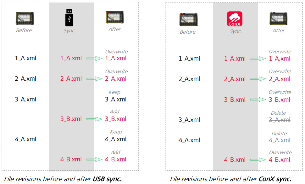 Files on the USB stick, or in ConX, will NOT be deleted or overwritten as a result of synchronization.