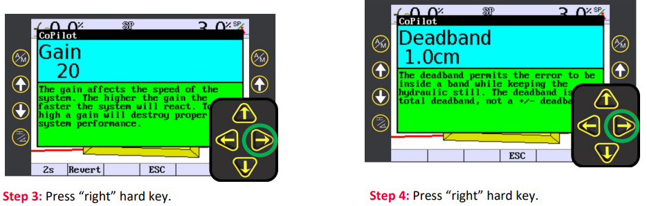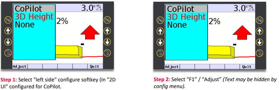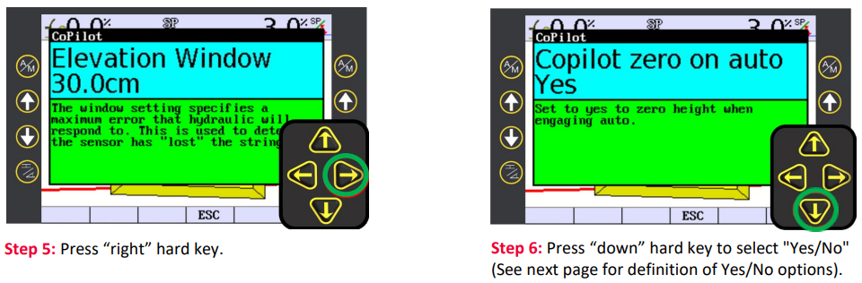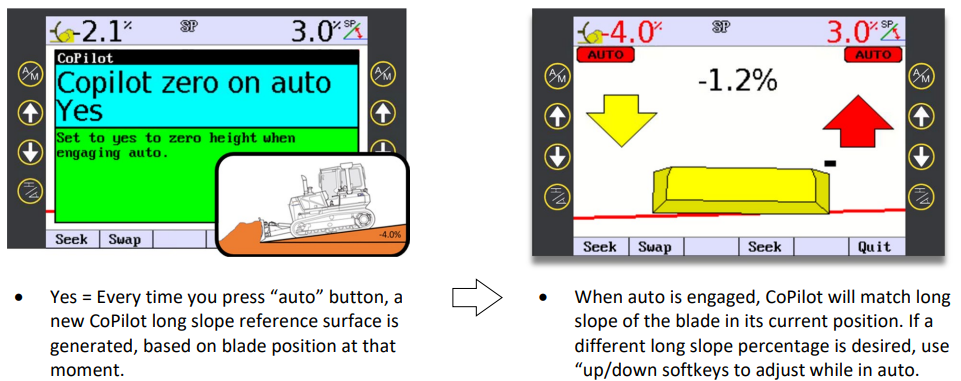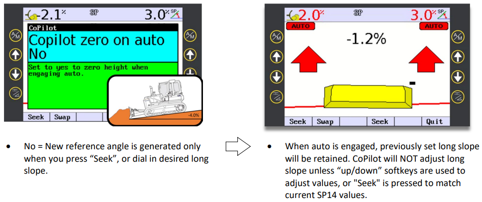 CoPilot uses information from the SP14 sensor when storing long slope values of your reference surface. You need to set the benchmark (zero) value with the blade itself. There are two ways to use CoPilot: 01) Zero on Auto YES and 02) Zero on Auto NO. In both modes, when cross slope side is put into "Auto", cross slope maintains the value that was dialled in.