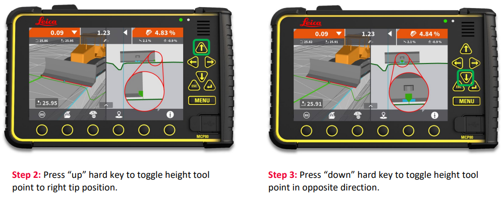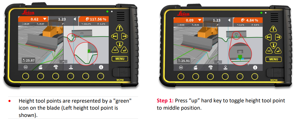 Workflow 06: Change "height tool point" The height tool point defines where MC1 looks for elevation guidance, when a height "reference" is selected. The "up" and "down" hard keys on the MCP80 panel toggle active height tool point.