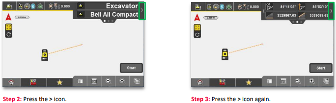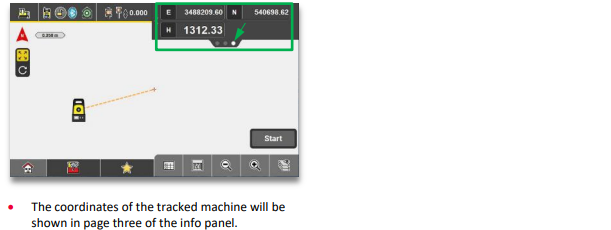Workflow 11.11. View machine position (iCON Site), (3D) If a TPS running iCON Site is connected to your machine, the “Machine Control" application shows the tracked machine on the map. The info bar also provides relevant position information.