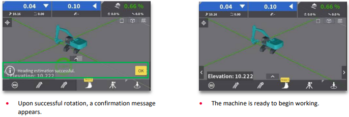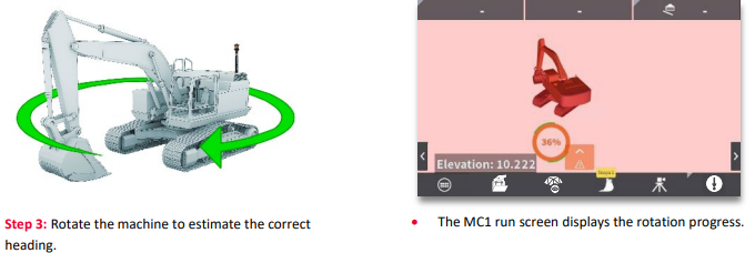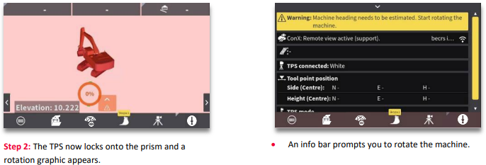 When you’ve connected your TPS to MC1 it’s time to start working. To get the bucket position when using single TPS, we need to rotate the machine to estimate heading. This heading must be re-established whenever the machine has shifted, or is tracked to a new position. Machine rotation is not necessary when using dual TPS (Workflow 11.7.).