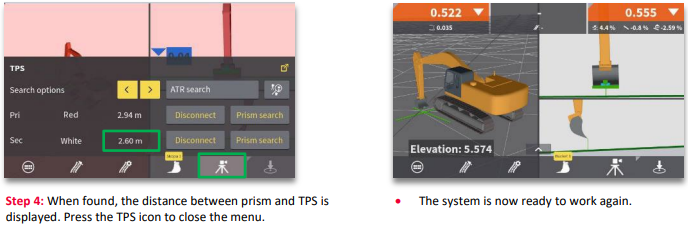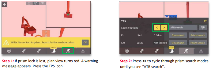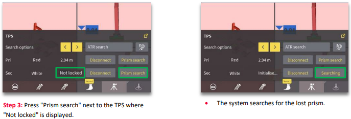 The TPS is often able to re-connect by itself if the machine prism stays in the same general area. But, if the TPS does not reconnect automatically, you must perform a prism search to re-connect.