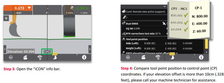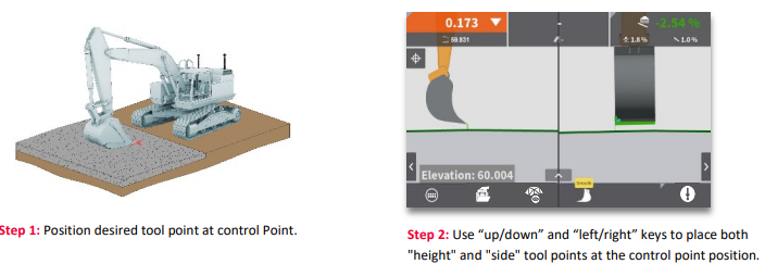 An ideal control point, to use for machine check-in, is positioned in an area that will not be disturbed for the duration of the project. The location should allow for the machine and cutting edge of bucket to be level in cross slope. It is recommended to use a spotter on the ground to position the blade precisely.