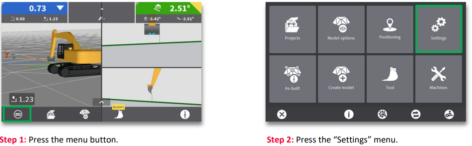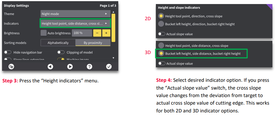You can choose between two indicator options for the MC1 run-screen. This is true for both a 3D and a 2D solution. The next pages provide a visual overview of the two options for each solution, and tells you step by step how to select them. Settings for colors and tolerances are configured in "Main Menu > Tool > Tolerances.
