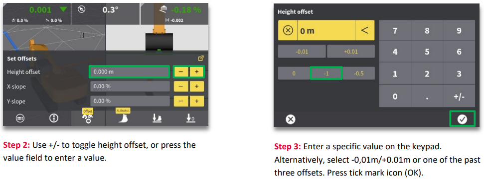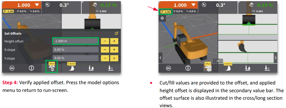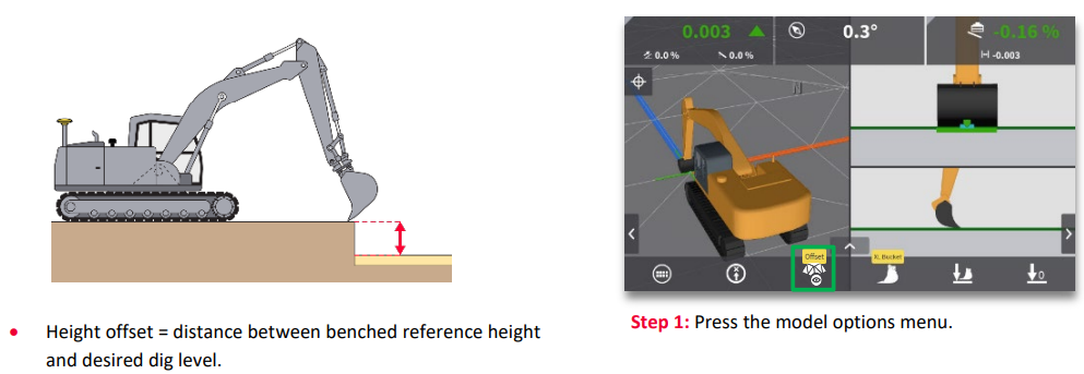 Workflow 4.10. Offset benched bucket height (2D) It is often desirable to enter a height offset after benching. This is used to establish dig depth so the MC1 system can provide guidance to the desired elevation.