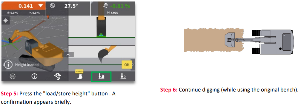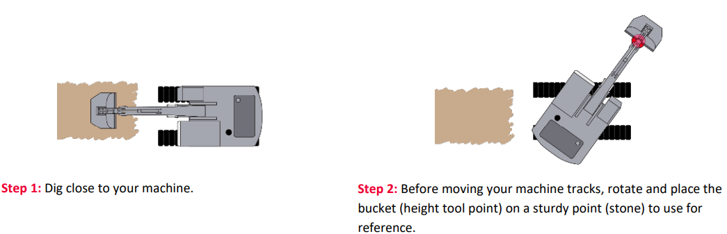 When using a bucket for reference, you can use moving point (load/store) to transfer a benched elevation by a common reference point. Moving point (load/store) is only applicable after the system has been benched. It requires a sturdy reference point (such as a stone) that the operator can access from the original working position and the new machine position. Be aware that the accuracy of transferring a benched elevation depends on how stabile the chosen reference point is. Using this method over multiple transfers may eventually introduce error.