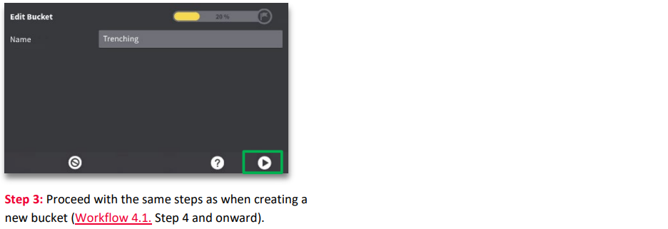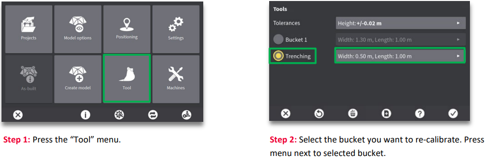 Workflow 4.2. Re-calibrate a bucket (2D/3D) Re-calibrate when the cutting edge has been changed or has been worn down significantly.