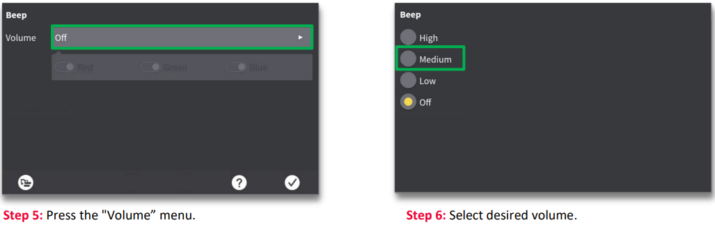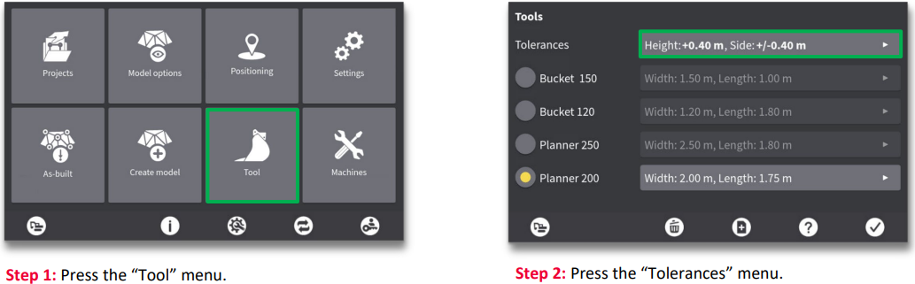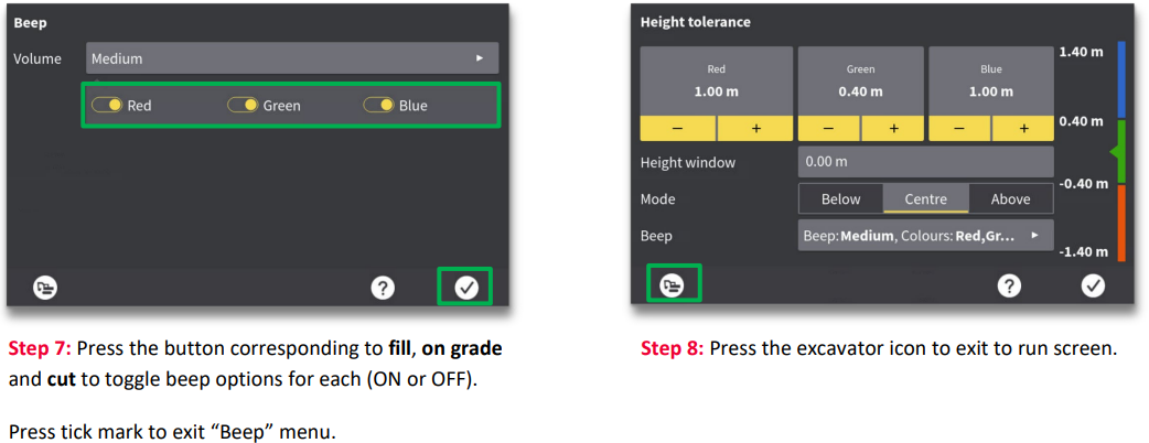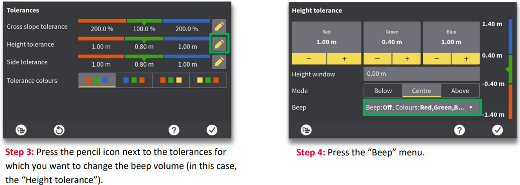 Use the beep volume option to set how loud the control panel is to beep and when. This workflow describes change of beep volume for height tolerance, but it also works for cross slope tolerance.