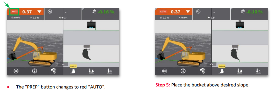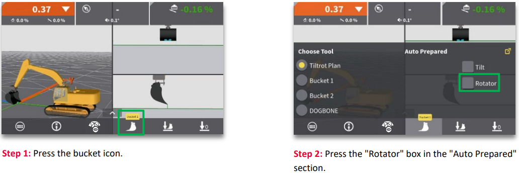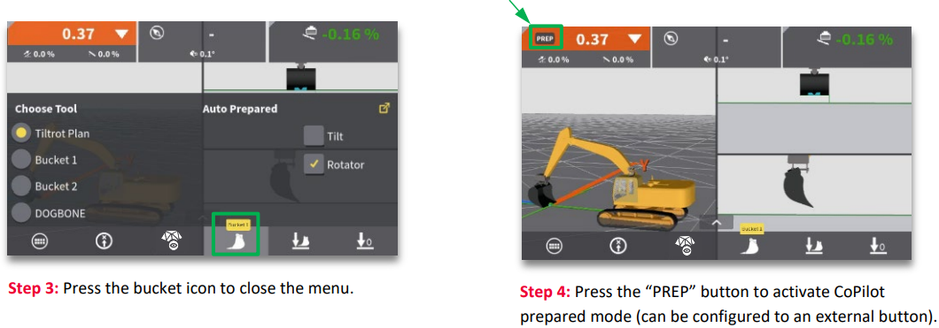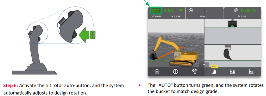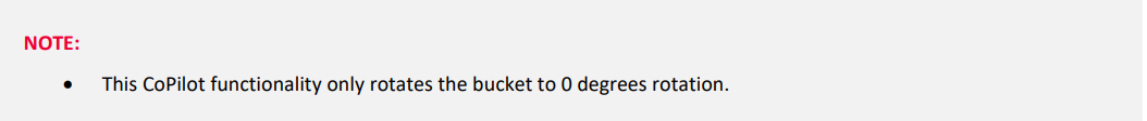 Workflow 7.2. Engage CoPilot auto rotator (2D/3D) CoPilot for rotator automatically rotates the bucket to match design rotation. It is recommended to use “closest to” height tool point (Workflow 4.6.) when using CoPilot auto rotator.