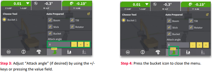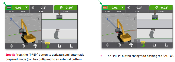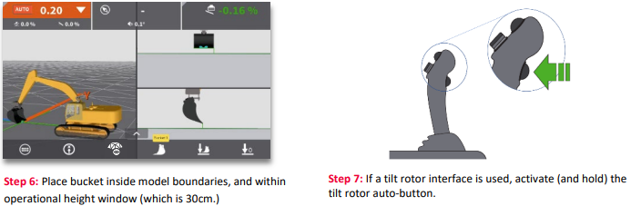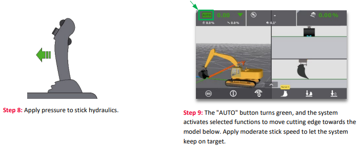 Workflow 7.3. Engage semi-automatic machine control (2D/3D) It is recommended to use “closest to” height tool point (Workflow 4.6.) when using semiautomatic excavator functions.
