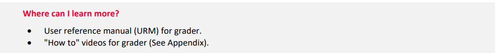 If you need more in-depth knowledge about any of the workflows, feel free to dive into the user reference manual (URM) for grader. Alternatively, look at the "how to" videos available through QR coded links (See Appendix).