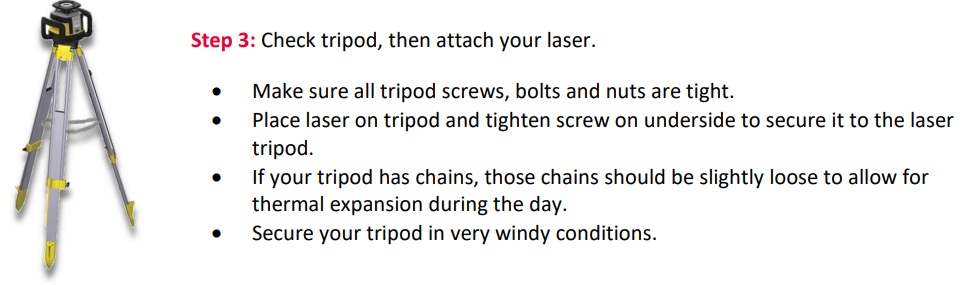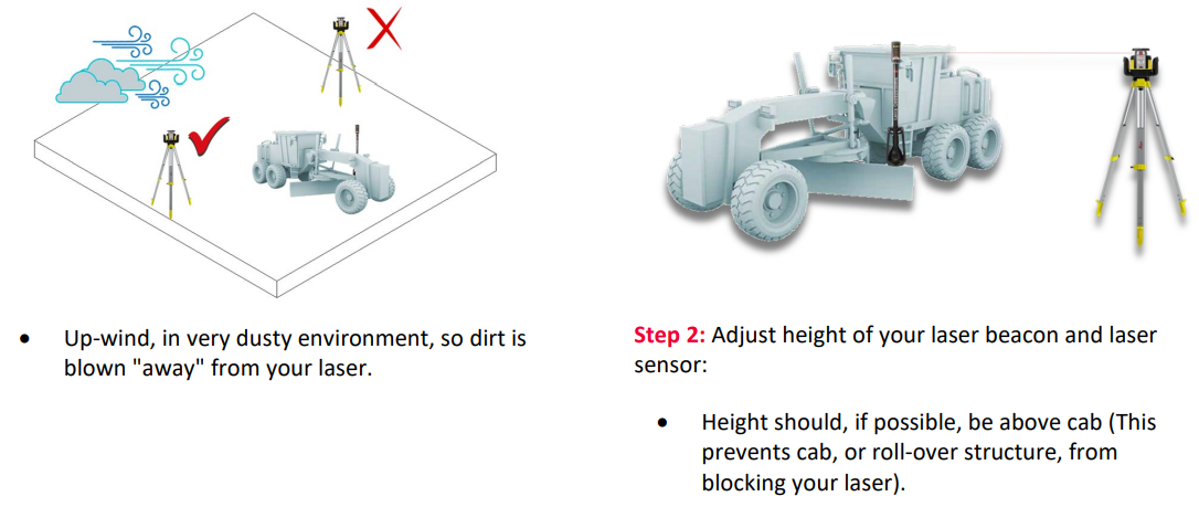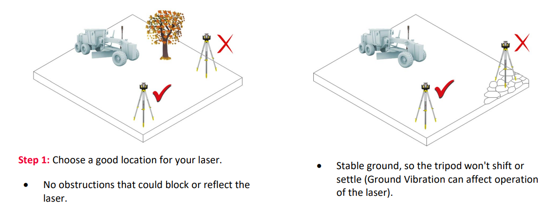 Set up a machine control laser for optimum coverage of the job site. It must be out of traffic and any obstructions. Position laser and tripod at a height equal to the laser receiver mounted on your machine, when it is on grade. Adjust alignment of your laser