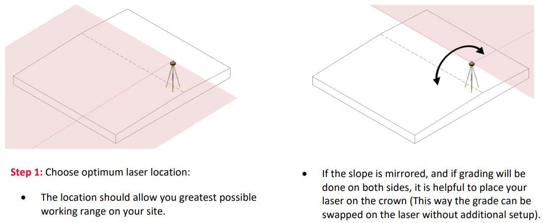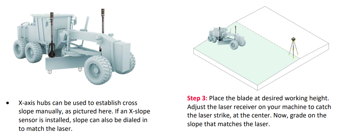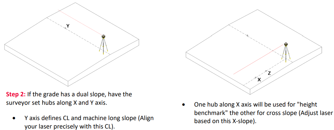 Workflow 06: Setup a laser to create dual sloping surfaces Dual Sloping surfaces are defined by a master alightment (Y) and a cross-slope on either side (X). Optionally an additional hub can be set for height reference (Z) along the X-axis.