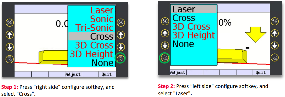 Single Laser is an economic option, but you must be aware of the travel direction when grading. Travel diagonally across a slope will provide incorrect guidance with single laser. Cross slope values must match entered value in laser.