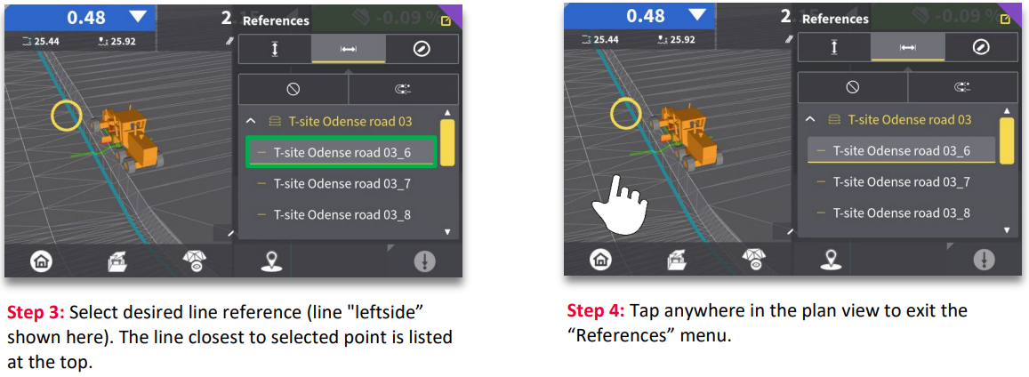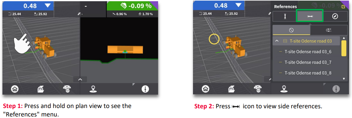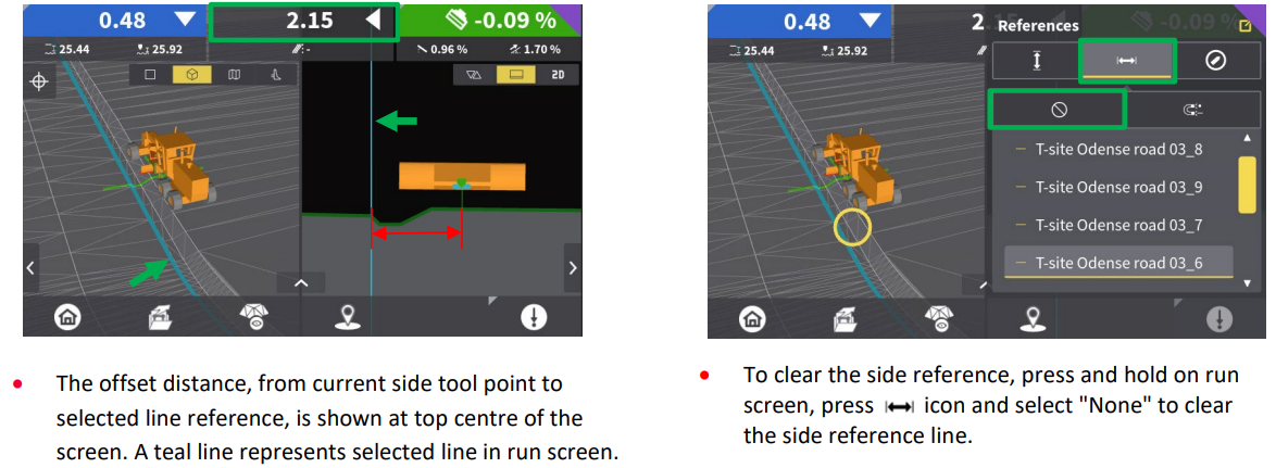 From the run screen, you can select and use different parts of your model as "side reference". The "side tool point" defines where MC1 looks at the model for horizontal guidance. Select a point or line, and you will see a navigation bar at the top of the run screen. This navigation bar will guide you to the selected reference, based on your active side tool point. See Workflow 07