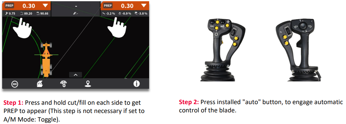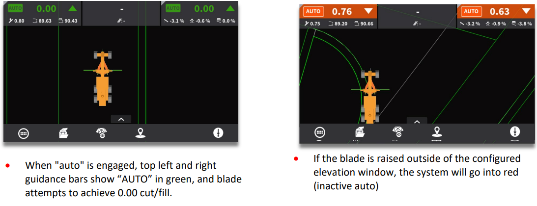 If your machine is equipped with automatic functionality you can activate automatic blade control, when the blade is within a specified distance from the design. When in "auto", the blade will attempt to achieve 0.00 cut/fill. Please ensure your machine is pushing material when "auto" is engaged.
