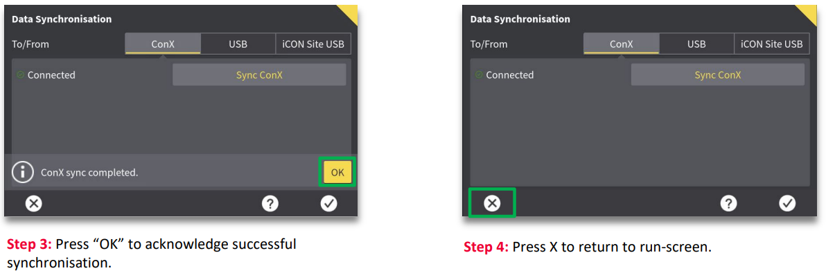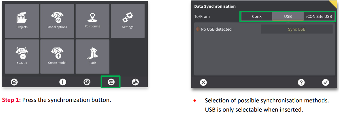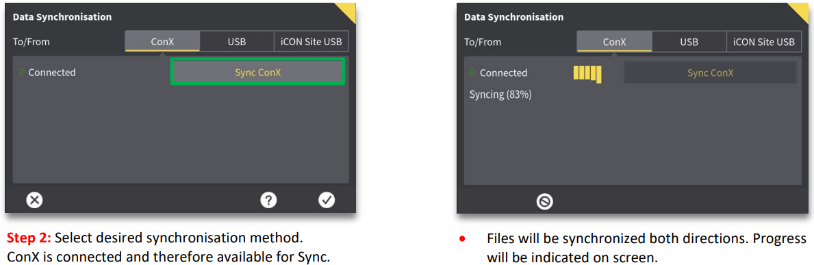 Files can be synchronized to ConX or a USB key. This way you can send or receive files between machine and office.
