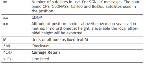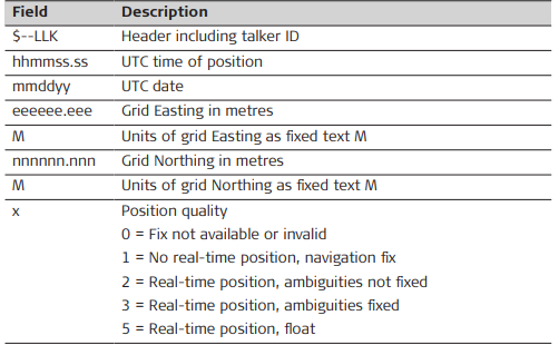 Syntax: $--LLK,hhmmss.ss,mmddyy,eeeeee.eee,M,nnnnnn.nnn,M,x,xx,x.x,x.x,M*hh