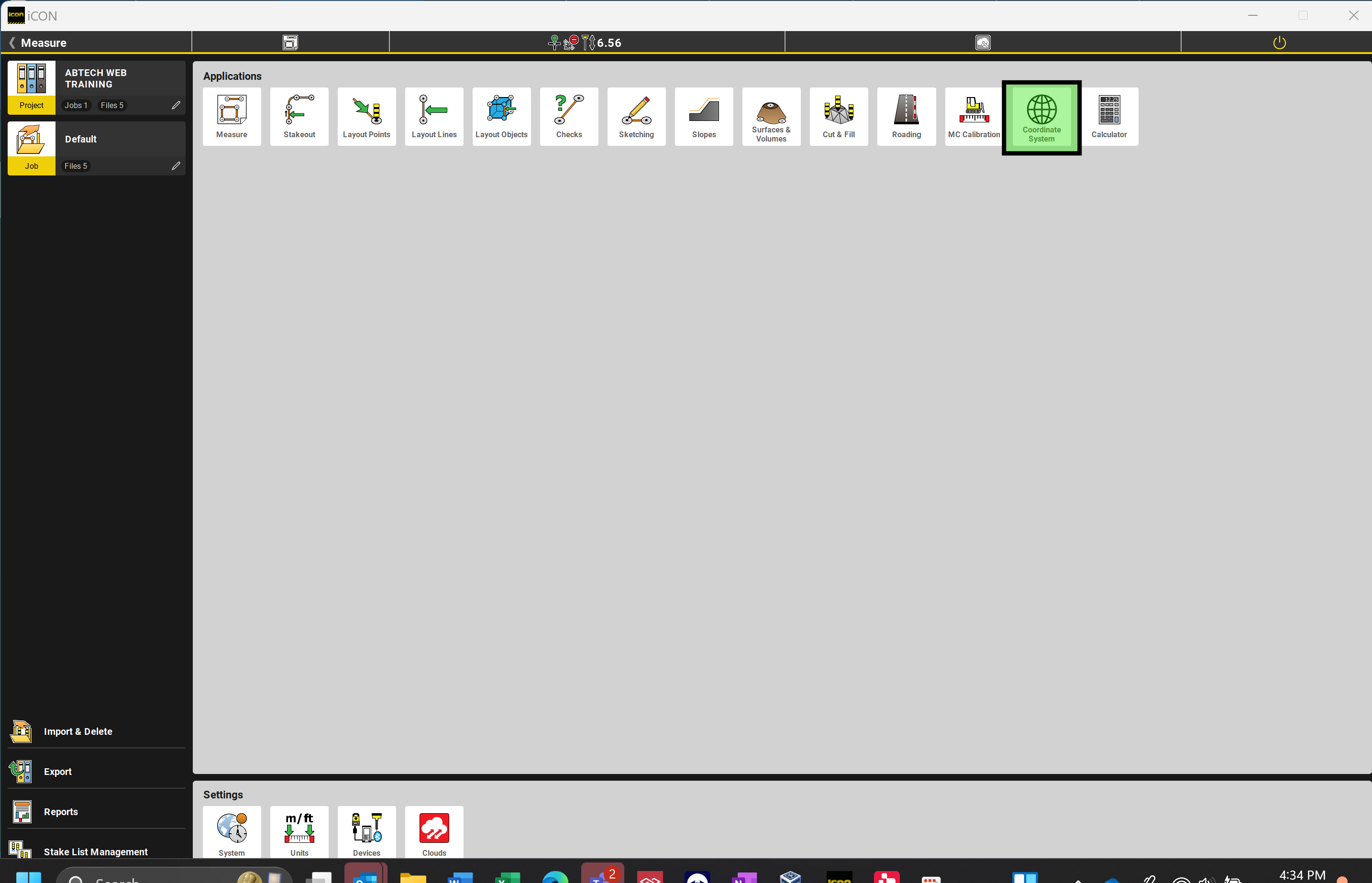 From the home screen, open the Coordinate System application. This menu offers multiple options for defining your coordinate system: