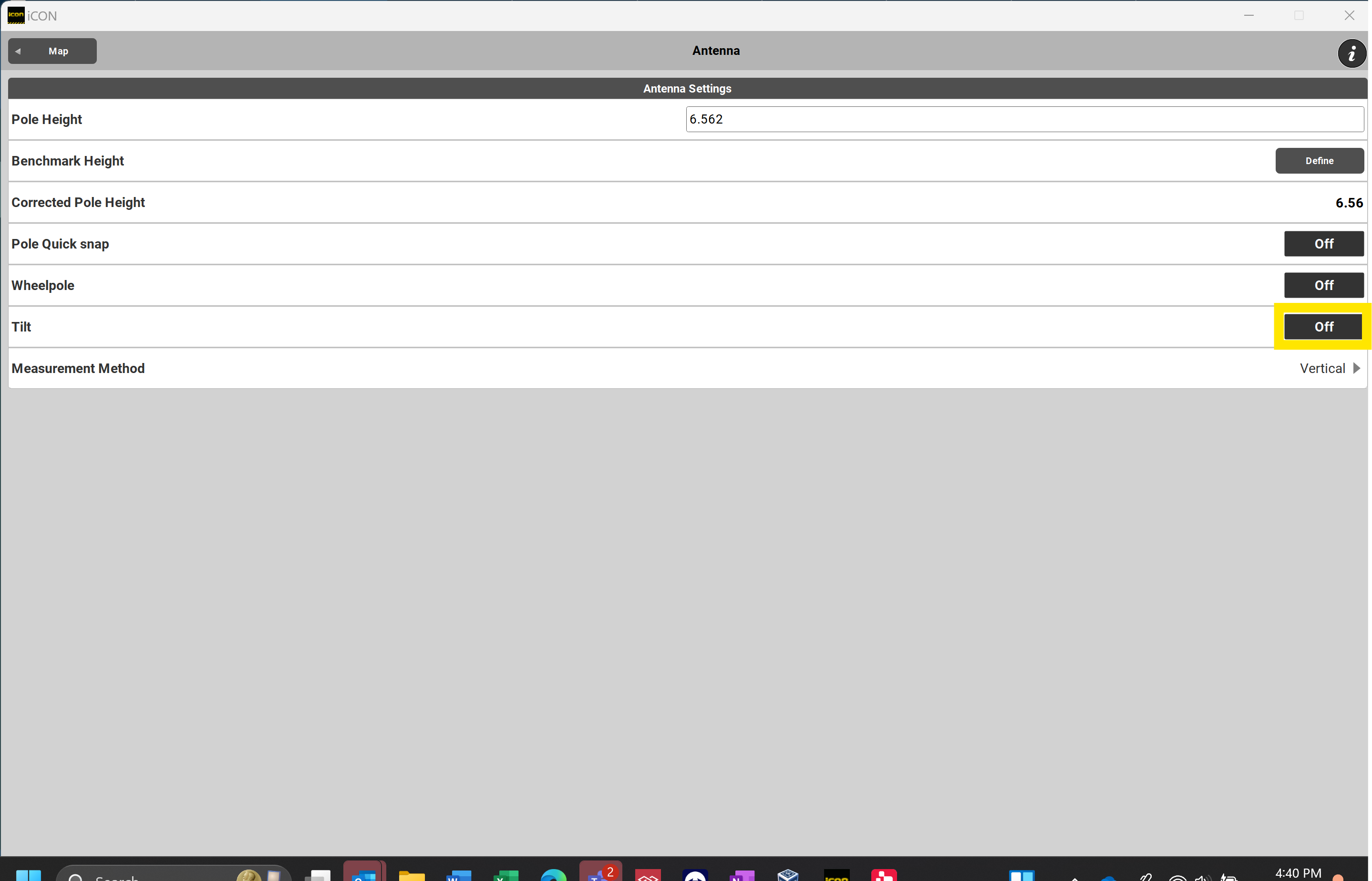 Turn off tilt compensation if using a rover like the iCG70 or iCG160, as tilt compensation can introduce errors. Select Status Bar 1, Select Antenna, Turn Tilt to "Off"