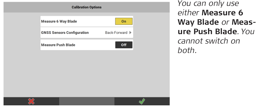 - In the Calibration Options screen switch Measure 6 Way Blade on and select the GNSS Sensors Configuration.