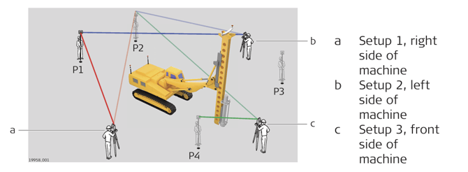 - To measure the points visible from the front side of the machine: Setup the total station at the front side of the machine at a distance so that it is possible to measure all the required points, especially the point at the top of the tower.