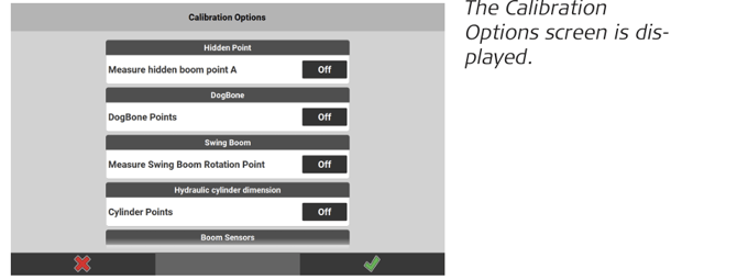 If you want to calibrate the excavator including the additional options, set the desired option to On. For more information, refer to 9.5.3 Additional Calibration Options for Excavators.