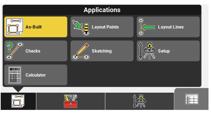 • Contains Camera, Calculator and TPS setup, when connected to a TPS.