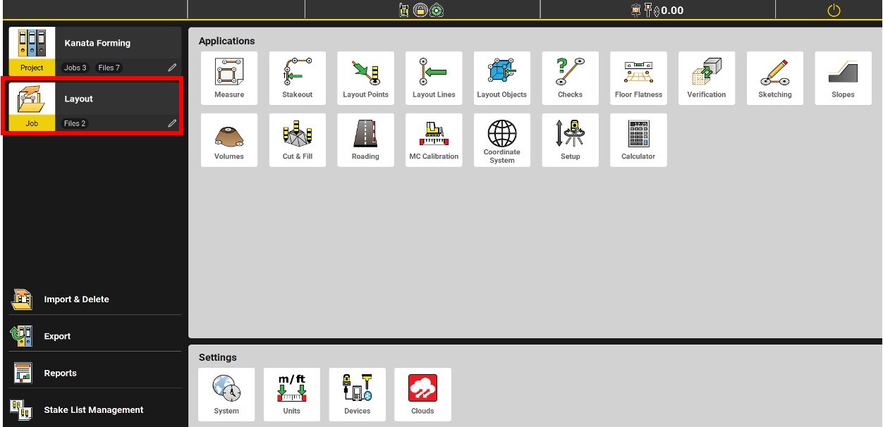 It is recommended to start by creating a new job within the project. A job is usually named according to the area or date of the job. The surveyed and created points are saved in the active job and you will be able to export each job independently.