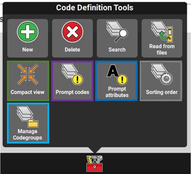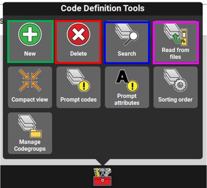 Several options are available in the toolbox of the Codes menu: