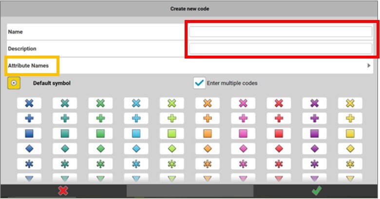 Give the code a name and select the desired symbol to be displayed on the map. It is also possible to give a description to this code.