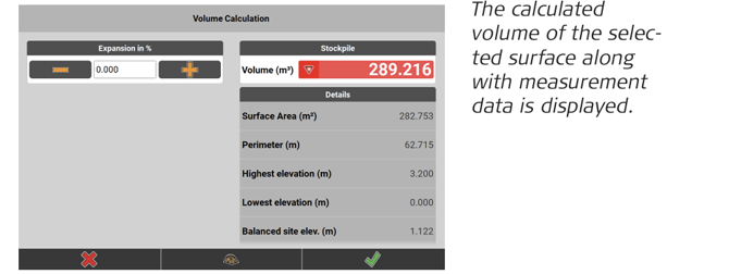 - If needed, adapt the Expansion value: enter a positive ( = swell) or negative ( = shrink) percentage value of the calculated volume. The calculated volume is adapted immediately.