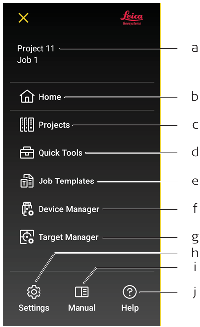 Menu a) Active project and jobb) Homec) Projectsd) Quick Toolse) Job Templatesf) Device Managerg) Target Managerh) Settingsi) Manualj) Interactive Help How to Access: Tap Menu on the Top Bar.