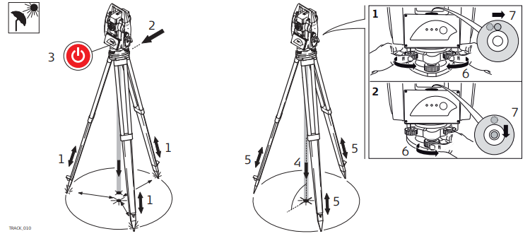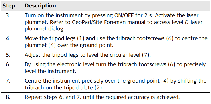 • The laser plummet described in this topic is built into the vertical axis of the instrument. It projects a red spot onto the ground, making it appreciably easier to centre the instrument.