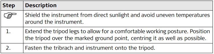 This topic describes an instrument setup over a marked ground point using the laser plummet. It is always possible to set up the instrument without the need for a marked ground point.