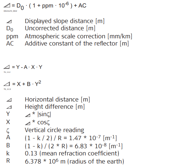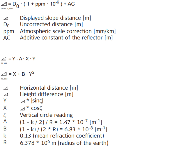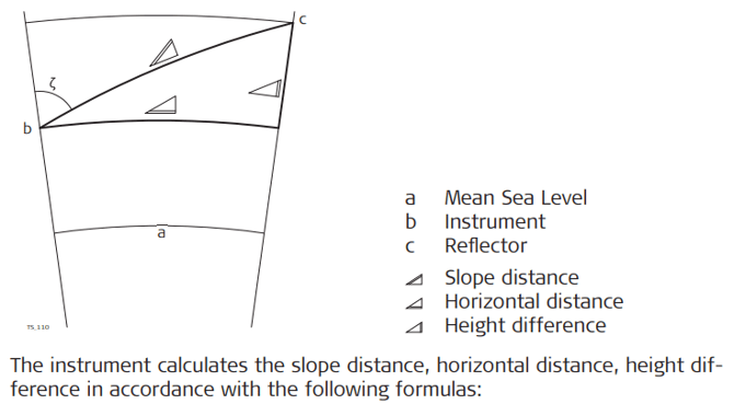 The instrument calculates the slope distance, horizontal distance, height difference in accordance with the following formulas: