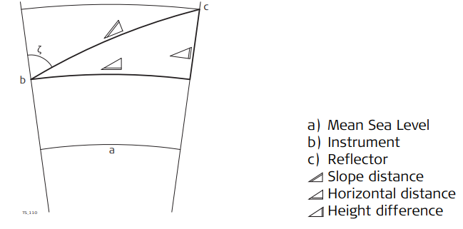Earth curvature (1/R) and mean refraction coefficient (k) are automatically taken into account when calculating the horizontal distance and height difference. The calculated horizontal distance relates to the station height and not to the reflector height.