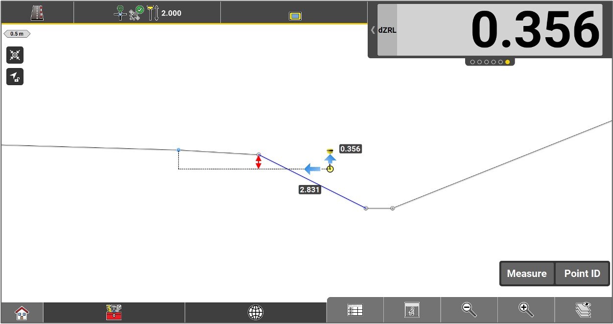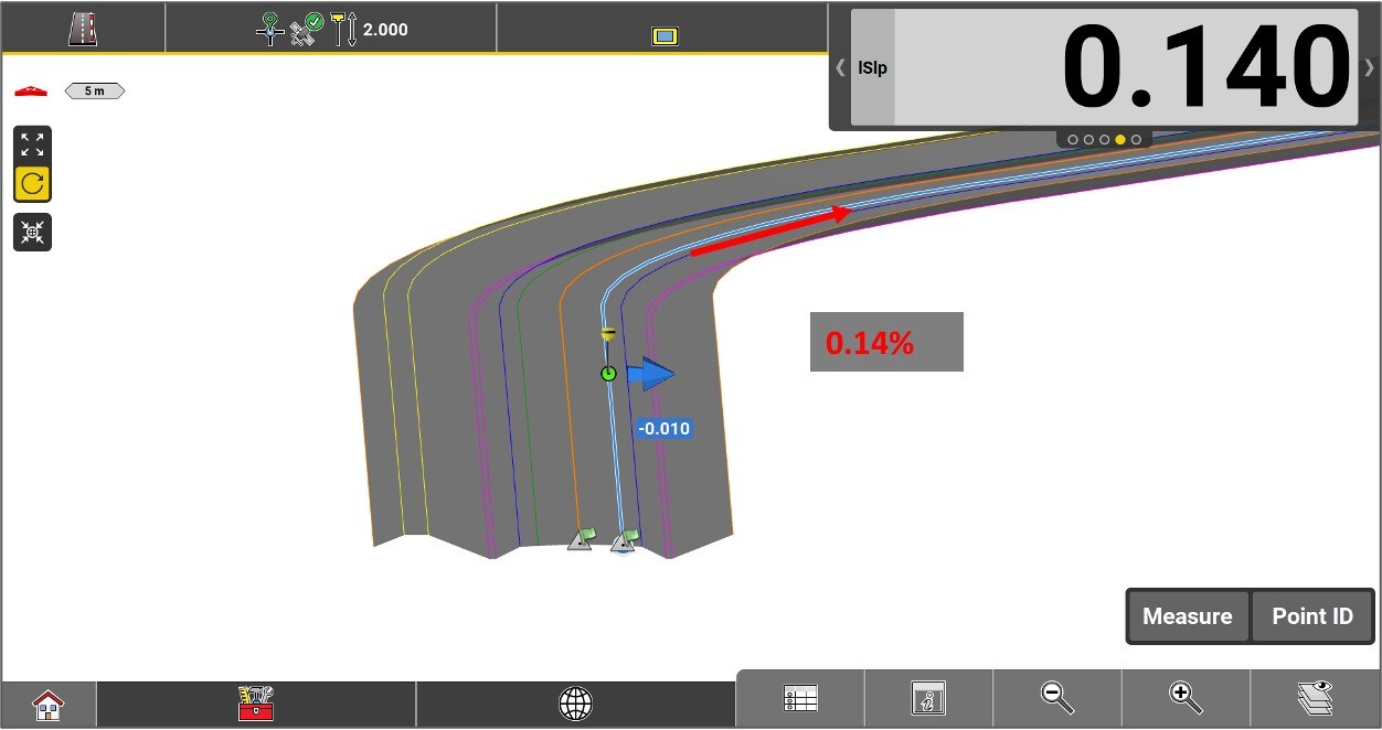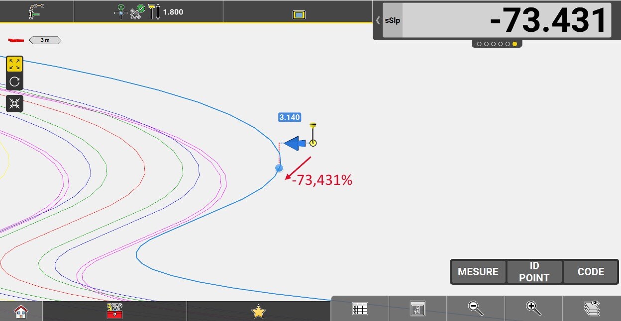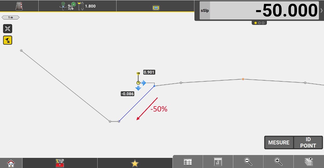 Important note: In stakeout, "sSlp" becomes the perpendicular slope connecting the measured position to the reference line. The value is negative if the position is above the line.