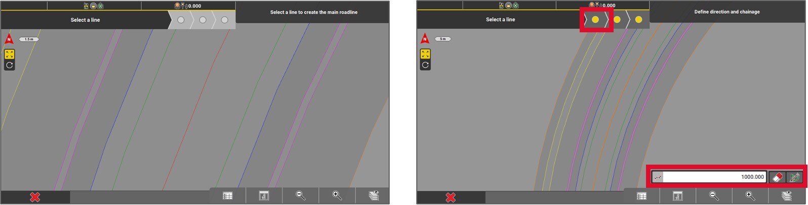 - Enter the initial chainage (for instance, 1000.000). If necessary, you can swap the start and end points of the road. Press the yellow dot to proceed.