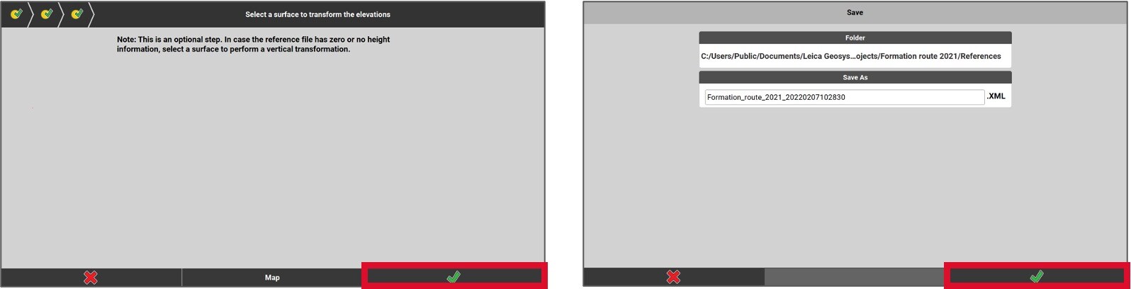 Select the desired centerline and enter the start chainage to apply it to the element. Press the Green checkmark. This function generates a new road file in XML format. The previously created file will be disabled.