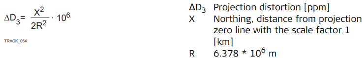 The magnitude of the projection distortion is in accordance with the projection system used in a particular country, for which official tables are generally available. The following formula is valid for cylindrical projections such as that of Gauss-Krüger: