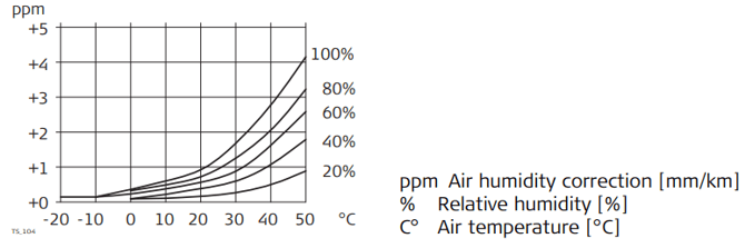 If the basic value of 60 % relative humidity as used by the EDM is retained, the maximum possible error in the calculated atmospheric correction is 2 ppm, 2 mm/km.