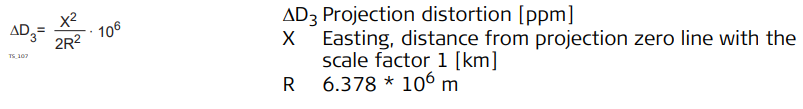 The magnitude of the projection distortion is in accordance with the projection system used in a particular country, for which official tables are generally available. The following formula is valid for cylindrical projections such as that of Gauss-Krüger: