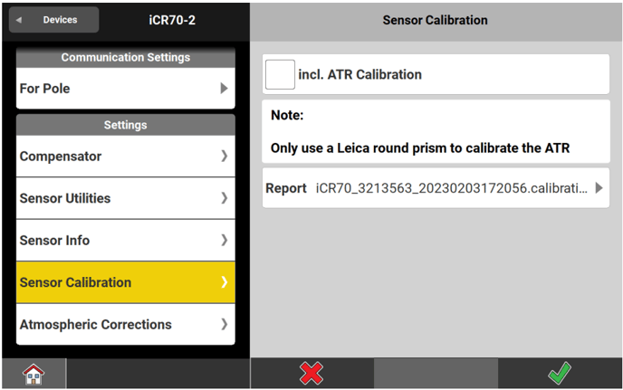 - Select the incl. ATR Calibration option if you like to calibrate the ATR. For ATR callibration a Leica round prism is needed. For Angle callibration no prism is required.