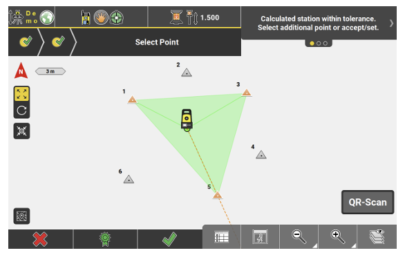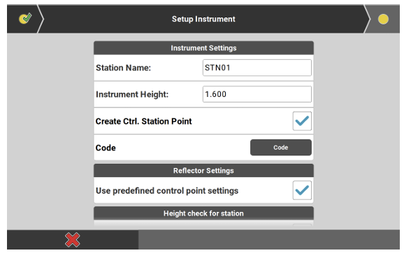 - Activate the Create Ctrl. Station Point tick box, in order to define the station point as a control point. In this case it is possible to assign a code to the station point. Tap the Code button and select a code. Activate the Create Ctrl. Station Point tick box, in order to