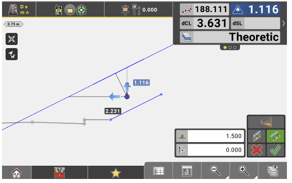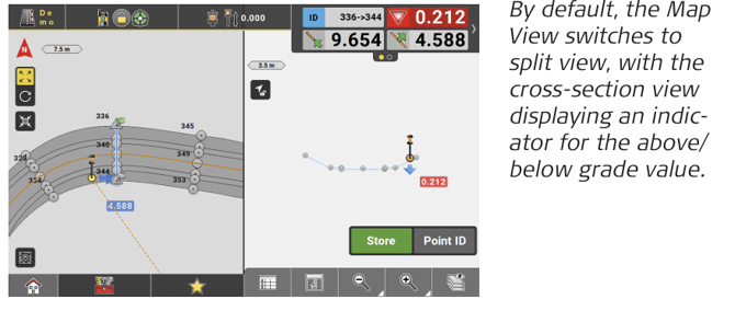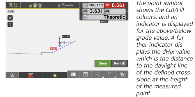 The view changes into cross-section mode and the target is shown against the cross section at the current chainage of the selected cross slope.