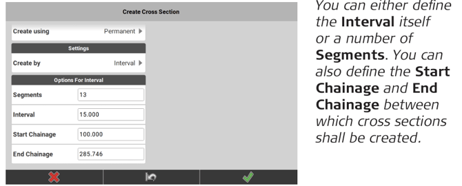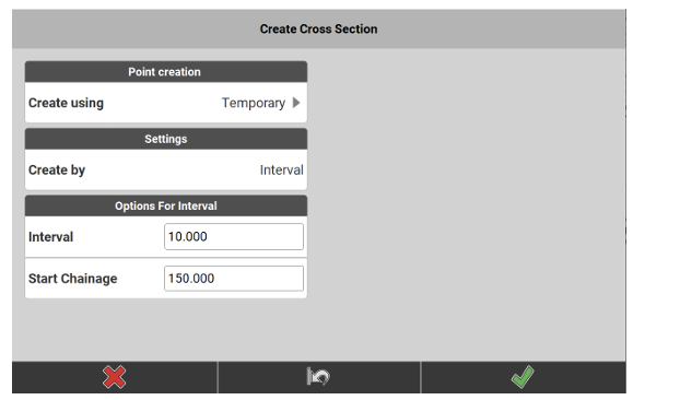 - Select Create by > Chainage and define a Chainage , in order to create one cross section at the given chainage. In order to create several cross sections along the road line at a given interval, select Create by > Interval and define the Interval.