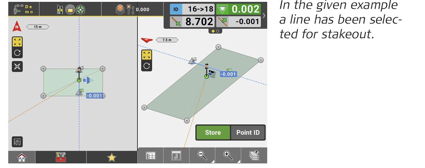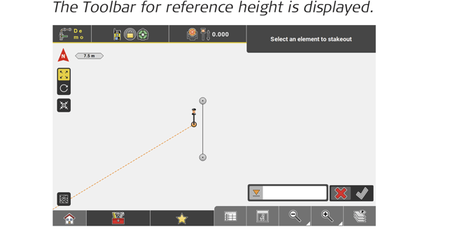 - Select a point, line or arc to be staked. Press Measure. The cut/fill value indicated in the information bar is calculated with respect to the projection of the selected element to the reference surface (not with respect to the selected element itself).